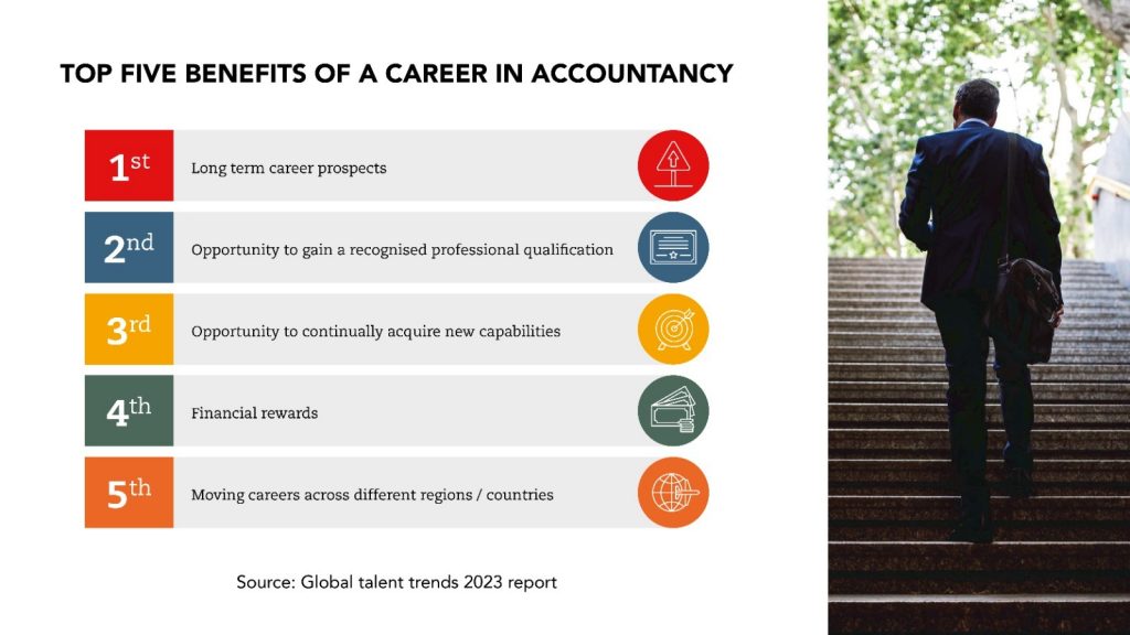 The accountancy field is known to provide career security in turbulent times, and given the changing world, accountancy is seen as a smart career choice for its flexibility, global mobility and growth prospects. The stability, rewards, and opportunities the profession offers remain highly appealing, with long-term career prospects seen as the number one benefit of a career in finance.